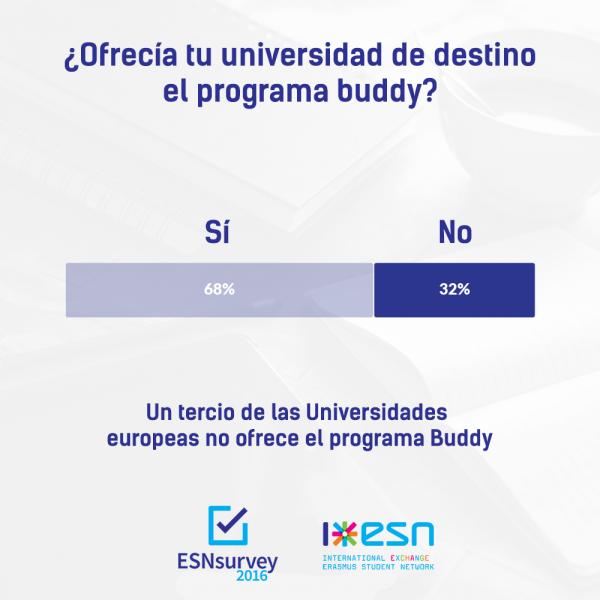 Servicios de la universidad de acogida (¿qué es lo que se ofrece?): Los datos recolectados muestran que la inmensa mayoría de las instituciones de acogida ofrecen una charla de presentación, un curso del idioma del país de destino, una asociación de ayuda a los estudiantes internacionales y una semana de orientación o de bienvenida. Sin embargo, los datos son algo menos alentadores en lo que se refiere la asistencia para encontrar alojamiento (poco más del 51%), y de las charlas sobre diferencias socioculturales (32%). Además, solo dos de cada tres universidades ofrecen la posibilidad de asignar un buddy (estudiante local que ayuda al estudiante internacional en su adaptación en la ciudad de destino). Las recomendaciones en este apartado pasan por una prevención de los potenciales problemas que pueden ocurrirles a los estudiantes internacionales en la ciudad o institución de destino mediante, por ejemplo, la provisión de información sobre el coste de vida, cursos o exámenes a realizar antes o nada más llegar a la institución de destino, facilitar la inscripción en las asignaturas etc. Asimismo, se insiste en la importancia de la cooperación entre las instituciones de educación superior y las asociaciones de estudiantes locales (como ESN), pues de este modo puede facilitarse la gestión de dichos servicios.