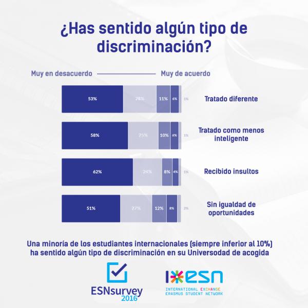 Adaptación académica de los estudiantes internacionales (¿cuál es el nivel de dificultad?): con respecto al nivel de adaptación, los resultados obtenidos muestran es que solo una pequeña minoría de los encuestados (en todo caso menos del 10%) alude específicamente a haber recibido un trato desigual o injusto con respecto a los estudiantes locales, haber sido tratados como menos inteligentes, recibido insultos, o haberse sentido con menos oportunidades que los estudiantes nacionales. Además, la satisfacción general con los estudios en el extranjero fue mayor entre los estudiantes que afirmaron que sus profesores promovieron la interacción de los estudiantes internacionales en sus clases. Todo ello nos lleva a percibir la importancia de crear un entorno académico que favorezca la integración de los estudiantes internacionales a fin de conseguir una experiencia en el extranjero más positiva.