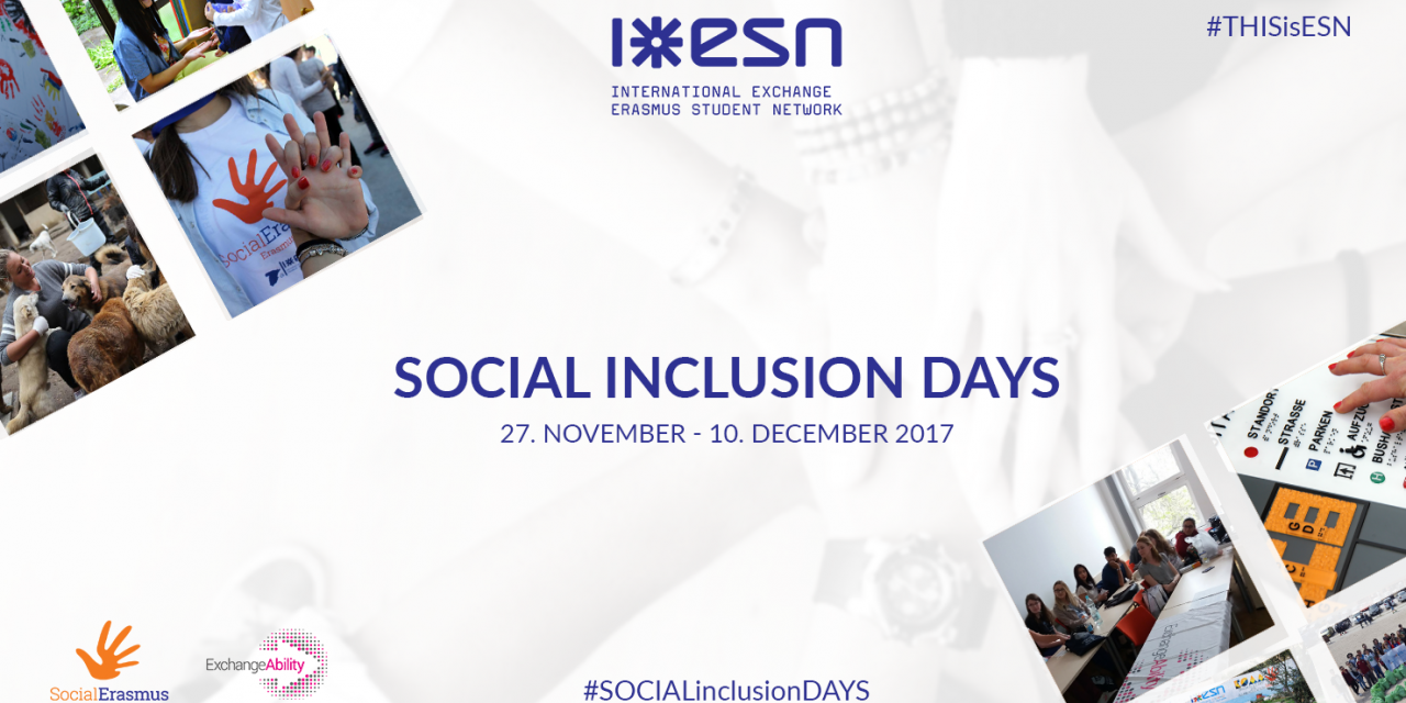 Erasmus Student Network (ESN) organiza los Social Inclusion Days como una iniciativa donde las más de 500 secciones locales, presentes en 40 países europeos, llevarán a cabo eventos para tomar conciencia y actuar en el voluntariado y la inclusión social desde el 27 de noviembre al 10 de diciembre.